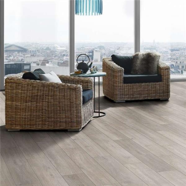 The Krono Original Eurohome Rockford Oak 8mm Laminate Flooring is a light and trendy grey flooring that delivers a modern, contemporary feel. This highly durable laminate floor offers a practical alternative to hardwood flooring, whilst retaining the appealing character of rustic oak. This product is manufactured with a water-resistant surface, offering added protection from moisture ingress.